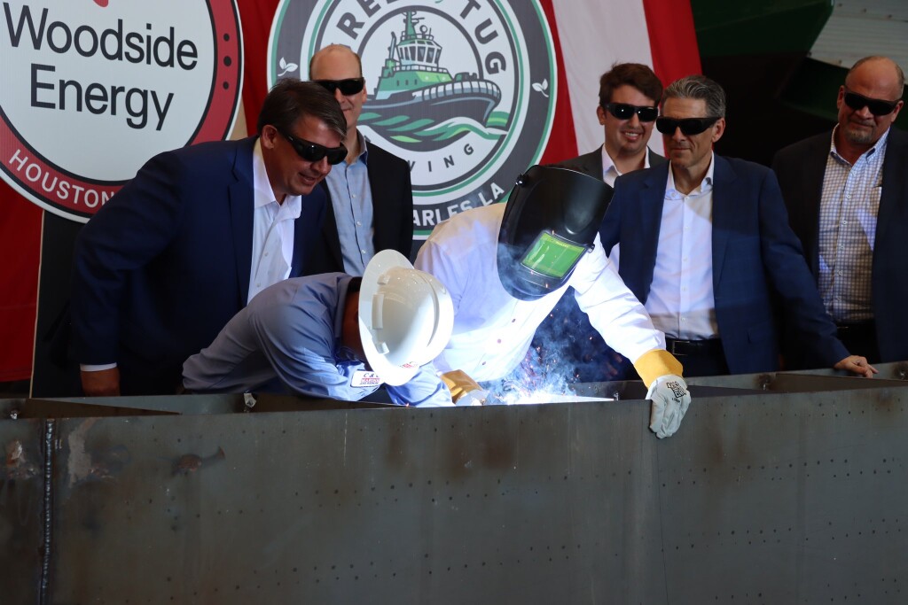 C&C Marine and Repair hosted a keel laying ceremony to signal the start of construction for four hybrid escort tugboats being built for Green Tug Towing to support LNG carrier operations at Woodside Energy's Calcasieu Parish terminal.