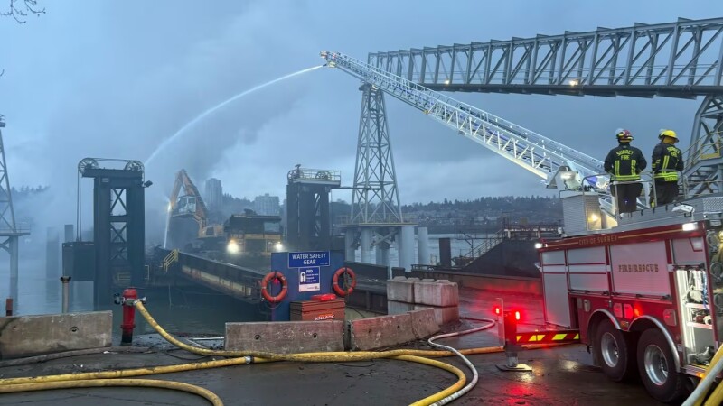 Firefighters and the Canadian Coast Guard responded to a barge fire in Surrey, British Columbia, that produced significant smoke and prompted air quality monitoring in the surrounding area.