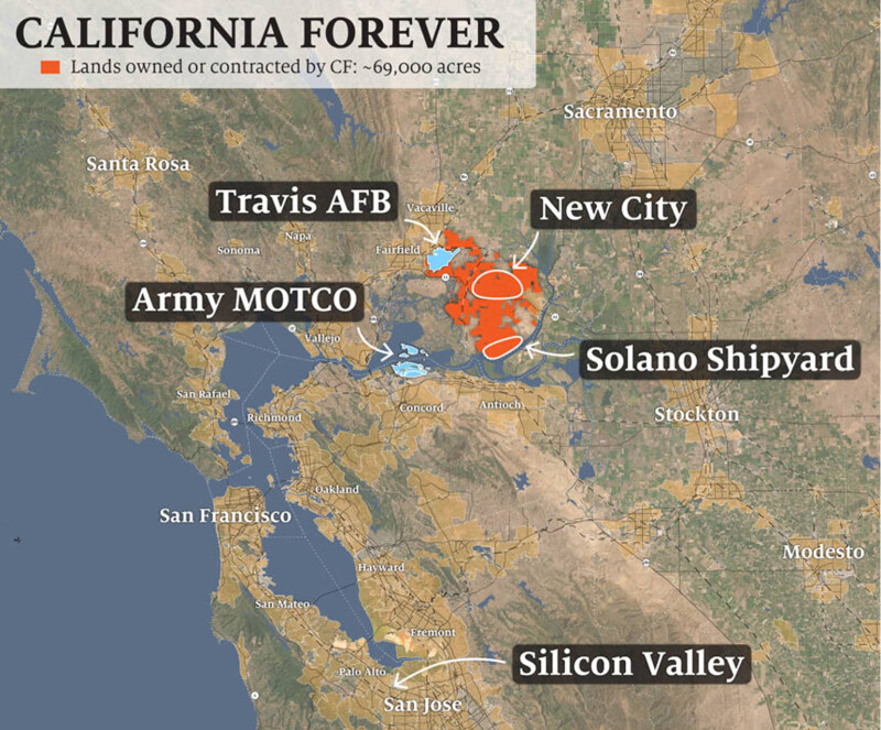 All plunked down in what is currently classified as “greenfield” farm country: rolling hills of undeveloped pastures and windfarms in rural Solano County, halfway between San Francisco and Sacramento. Initial funding for the massive project is being bankrolled by an elite group of wealthy Silicon Valley tech entrepreneurs who are pushing to sidestep normal regulatory reviews and break ground quickly.