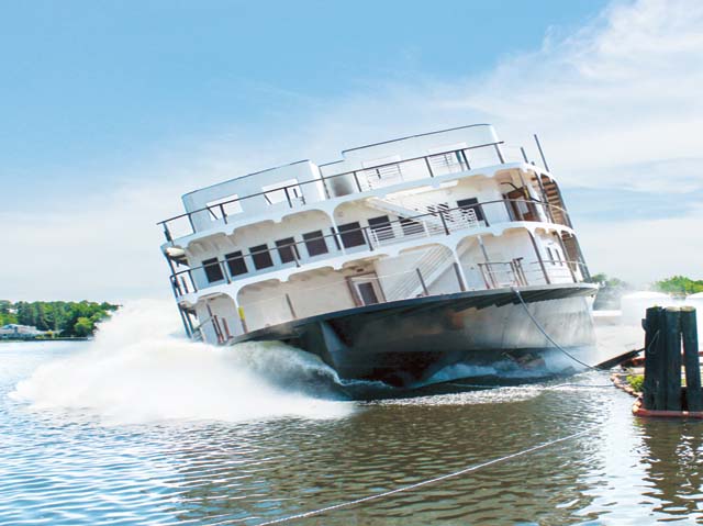 American Cruise Lines, Guilford, Conn., launched its newest paddlewheeler on June 29 at Chesapeake Shipbuilding, Salisbury, Md. Immediately after launching, tugs nudged the big hull into the yard’s outfitting basin, where the upper decks will be installed and outfitting completed. The launching came a few weeks after two 600-ton hull sections were joined together. When complete, the new riverboat will carry up to 150 passengers, like its sister vessel the Queen of the Mississippi, which went into service in 2012. In addition to these two vessels, American Cruise Lines plans to build two more riverboats over the next several years.