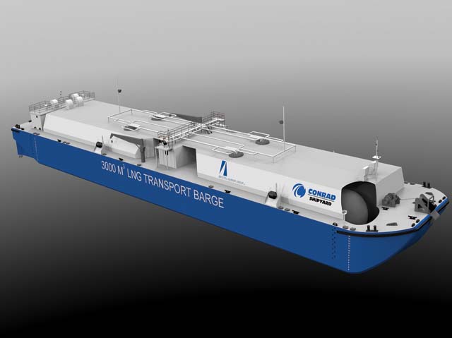 Bristol Harbor Group Inc., Bristol, R.I., in conjunction with Conrad Shipyard, Morgan City, La., is developing a 3,000-cu.-meter LNG transport barge for coastwise operations. BHG has received “approval in principle” from ABS for the design. BHG has a decade-long relationship with Conrad that has produced coastal liquid-cargo barges from 26,000 bbls. to 80,000 bbls. The 300' version of these successful double-hull oil barges serves as the basis for the LNG transport barge. Storage containment consists of four Type C pressure tanks, all equally sized at 750 cu. meters. The tank design offers suitable hold times for cargo transport without the need for reliquefaction. The design is focused on constructability and cargo safety.