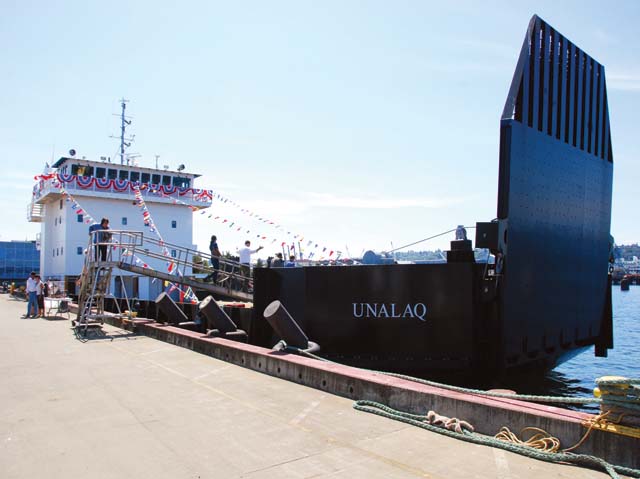 In August, a large group of Alaska natives from Barrow, Alaska, congregated in Seattle to christen their newest vessel, the Unalaq, a 150'×50'×8' landing craft with a loadline draft of 5'6".