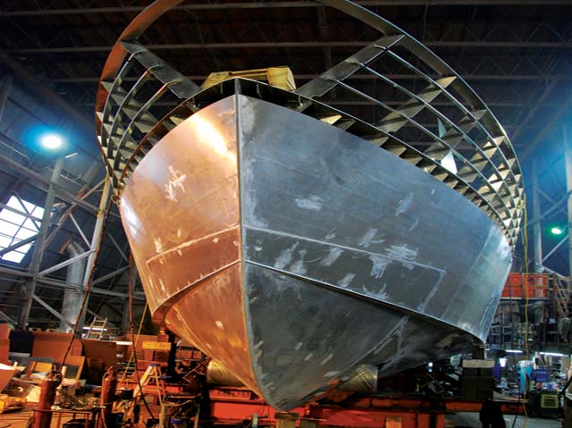 A flat chine plate transitions to a spray flat at the bow. “As the bow creates a bow wave, you get surface tension on that water in the bow that essentially wants to ride all the way up the hull surface,” said Myers. “If you don't have a solid break, that water is going to come right up to the top of the bulwark and you’ll end up with spray on the pilothouse windows. It effectively cuts that sheeting of water off the hull and makes for a clean and dry ride.”