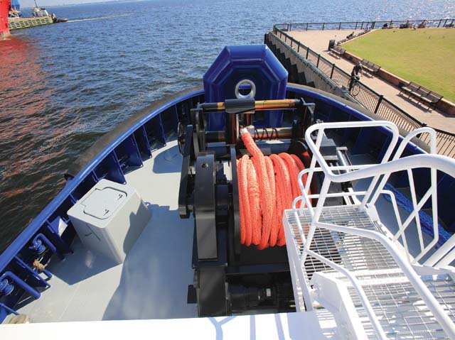 For ship-assist work, each tug has a Markey DEPCF-52S electric hawser winch on the bow. For ocean towing and rig moves, the tugs have a Markey TESD-34 100-hp double-drum electric towing winch on the stern.