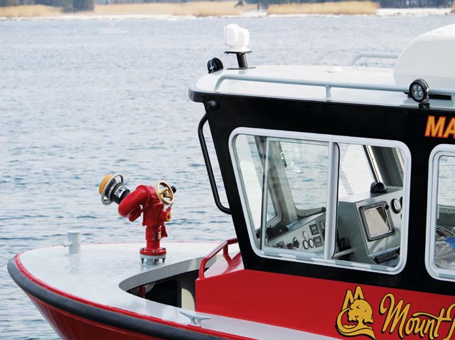 Like the South Carolina fireboat, the one for St. Paul moves quickly when its twin 250-hp Mercury Verado outboards are engaged. The Mercs push it to 42 mph, and once the 6" hydraulically operated diverter valve is engaged, water pumped by the 6-liter Kodiak diesel is redirected from flowing into the fire system to going out the transom through an American Turbine jet, giving the 31-footer a top speed of 48 mph.
