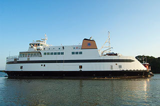 The Cat departs Detyens Shipyard in Charleston, S.C. Bay Ferries photo.