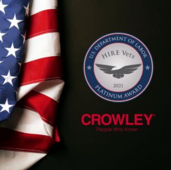 In receiving the award from the U.S. Department of Labor, Crowley has demonstrated and met rigorous veteran employment and workplace integration assistance criteria, ranging from veteran hiring and retention to providing veteran-specific resources, leadership programming, dedicated human resources, pay compensation and tuition assistance programs. This is the second consecutive year Crowley has earned the HIRE Vets medallion at the platinum level.