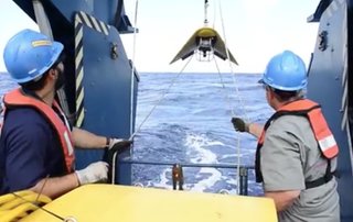Contractors from Phoenix International Inc. and the U.S. military retrieve and redeploy the tow ping locator aboard the Navy tug Apache.