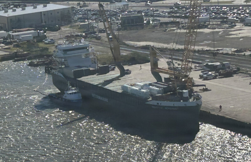 Photos shared by the Coast Guard show the vessel involved in the incident is the 10,029-dwt FWN Merchant, a 381'x58' geared tweendecker built in 2013.