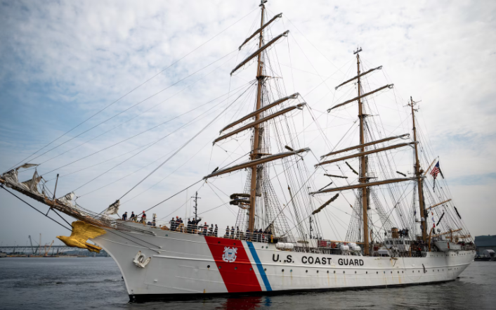 Eagle is the only active square-rigged vessel in U.S. government service. Constructed in 1936 by the Blohm and Voss Shipyard in Hamburg, Germany, and originally commissioned by the German navy, Eagle was taken as a war reparation by the U.S. following World War II. Eagle’s transit route home from Europe this year closely mirrored the ship’s first post-war journey as a commissioned Coast Guard cutter, when the ship traveled from Europe with stops in Madeira, Bermuda, and New York City.