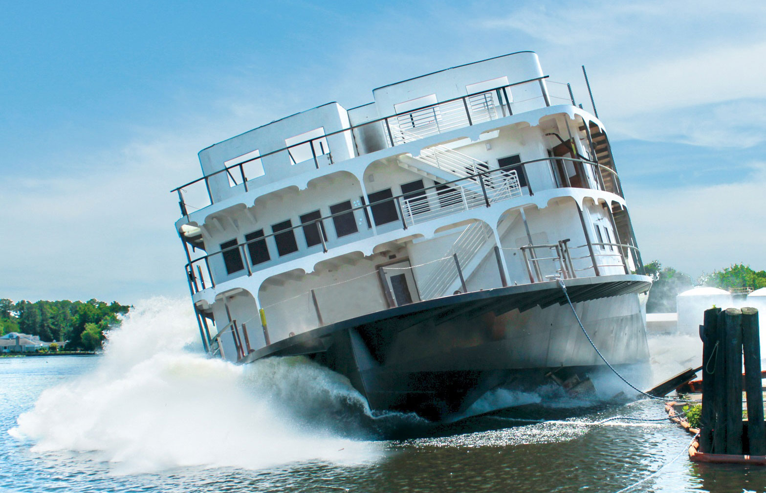 American Cruise Lines announced Tuesday the successful launch of the new paddlewheeler being built for the Mississippi River at Chesapeake Shipbuilding in Salisbury, Md. Immediately after being launched into the Wicomico River, tugboats nudged the new riverboat into Chesapeake Shipbuilding’s East Outfitting Basin where the upper decks and outfitting will be completed.