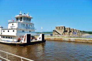 An American River Transportation Co. (ARTCO) barge tow passes through Lock & Dam 5 located at Mississippi River mile 738.1, 10 miles northwest of Winona, Minn.