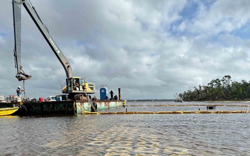 The project in St. Andrew Bay at Tyndall Air Force Base on the Florida Panhandle is using a “self-healing” reef of concrete modules designed by researchers at Rutgers University. A crane lowered the first segment of what’s planned to be a 160’ wide structure about 200’ offshore, composed of about 800 interconnected concrete cubes that Rutgers scientists created with colleagues collaborating from several institutions.