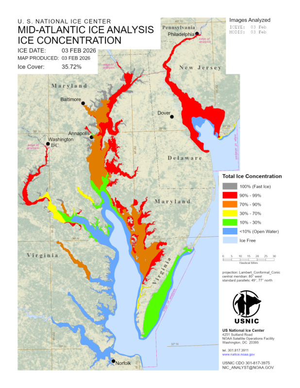 The ice will continue and potentially extend in the region into next week. The U.S. National Ice Center projected Feb. 3 that ice extent in the Mid-Atlantic coastal bays was exceeding 90% in most of Delaware Bay and reaching similar extent in some Chesapeake tributaries.