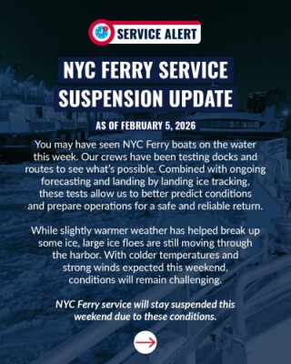 “You may have seen NYC Ferry boats on the water this week. Our crews have been testing docks and routes to see what's possible,” operators of the city’s now decade-old short route services wrote in a Feb. 5 online update. “Combined with ongoing forecasting and landing by landing ice tracking, these tests allow us to better predict conditions and prepare operations for a safe and reliable return.”