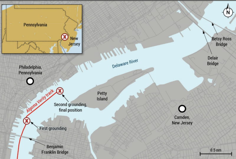 During 18 minutes the Algoma Verity transited from the Benjamin Franklin Bridge to a first grounding and on to the second, final grounding location, while “the ship’s heading never appreciably moved to port, with the exception of when the tugboat was pushing on the bow,” according to the NTSB report.