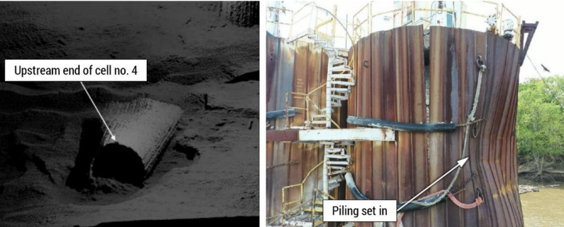 The TransMontaigne terminal reported damage to its dock structure, which consisted of four mooring Cell no. 3 sustained significant damage to the upstream piling structure and concrete cell cap. Cell no. 2 sustained fracture damage to its concrete cap.