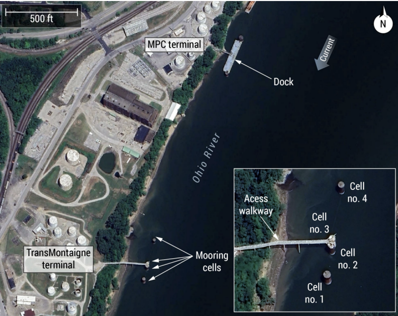 The barges at the Marathon Petroleum Corporation (MPC) terminal dock at mile 793.8 on the right descending bank of the Ohio river were carrying diesel fuel and gasoline when they broke free at mile 793.8 around 4:45 a.m. April 16, 2024.