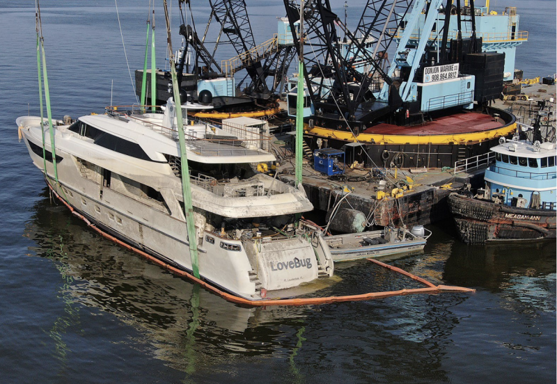 After salvage the Lovebug was towed to Yank Marine in Dorchester, N.J., for survey and overhaul. A marine surveyor and National Transportation Safety Board investigators found no visible hull breach or indication of a potential source of water ingress on the interior or exterior of the vessel.