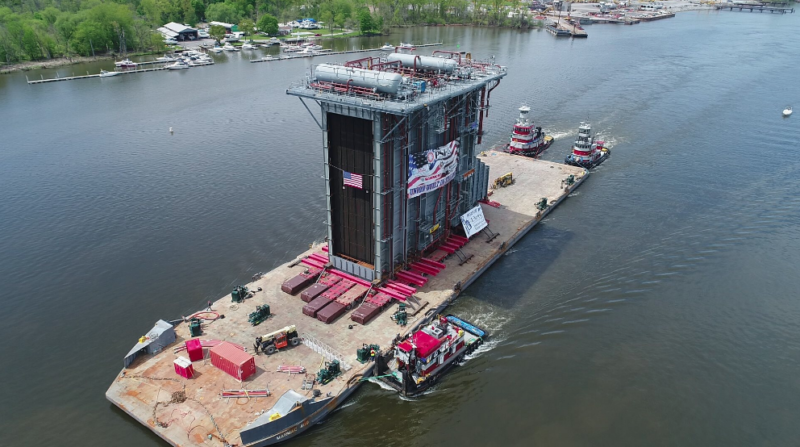 The 115’ tall, 7 million lb. structure departed by barge around 2 p.m., timed for the tides with an itinerary under the cross-Hudson bridges with enough clearance. After passing under the George Washington Bridge around 5 p.m. Tuesday, the plan is to anchor in New York Harbor near the Statue of Liberty around 8 p.m., then move with the tide through the East River, under the Brooklyn Bridge around 4 a.m. Wednesday and through Hell Gate to Long Island Sound.