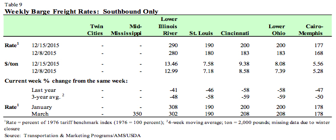 Barge rates continue to decline as barge demand has been weak. St. Louis export barge rates have dropped from 535% of tariff ($21.35 per ton) in late September to 190% of tariff ($7.58 per ton) on December 15.