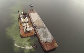 Contractors use heavy equipment to place fossilized oyster shells onto sanctuary reefs in the Great Wicomico River in Burgess, Va. Previous reefs were built using water cannons that shot shells over a large area, but the placement process has now been streamlined, as Susan Conner, environmental analysis section chief for the Norfolk District, U.S. Army Corps of Engineers, explains.