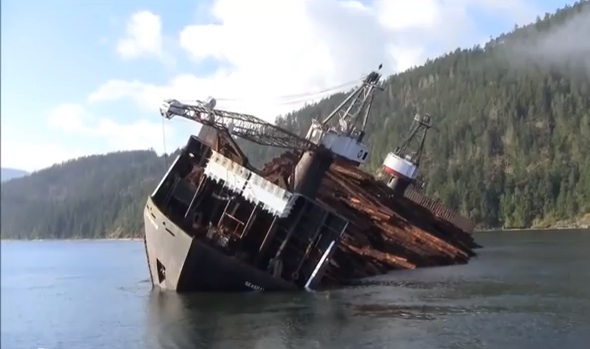 The timber barge Seaspan Harvester looks like it's capsizing when it drops its payload by tilting 30 degrees to deposit logs in the water.