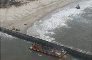 The Miss Katie wound up beached at Brigantine, on the north side of the inlet, and the 135’ barge with crane grounded up alongside the inlet’s north jetty, with the tow still attached. Commercial salvage workers and the Coast Guard freed the tug and barge on Sunday.