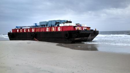 The Coast Guard was notified at 7:35 p.m. on Monday that the towing vessel Pushy had lost control of the 125' deck barge Weeks 236 it was towing following an interaction with a large swell off of Atlantic Beach, N.Y. After the tug and deck barge separated, the tug sank and the barge was pushed up onto the beach at Silver Point County Park, where its owners, Weeks Marine, Cranston, N.J., under Coast Guard supervision, began devising a plan to safely remove the barge. The exact cause of the separation and the sinking of the tug are under investigation.