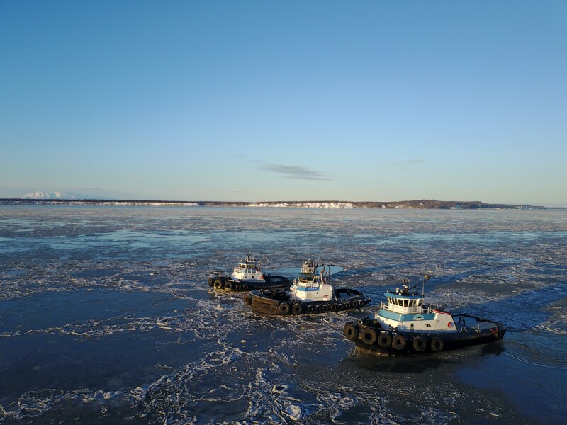 Cook Inlet’s ice, fast currents, and tides that can swing 25' to 40' in six hours also demand a high level of precision. When docking cargo ships in the winter on an iced-out river, CITB crews perform a maneuver they call “ice-shadowing”, where, on a flood tide, a tug will nose against the dock, creating an “ice-shadow” while two higher horsepower tugs sweep ice pans away as the ship is guided into a cleared pocket.