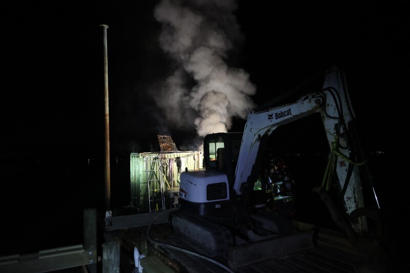 Firefighters arriving on scene found the fire contained to a Conex storage container located toward the stern of the construction barge. Crews were able to bring the fire under control by approximately 8:52 p.m., preventing the flames from spreading to an excavator and other heavy equipment on deck, as well as the dock structure under construction nearby.