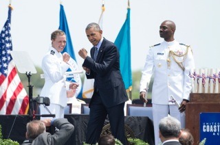 “We’re moving ahead with new Fast Response Cutters, new Offshore Patrol Cutters. We’re on track to have a full fleet of new National Security Cutters — the most advanced in history. And I’ve made it clear that I will not accept a budget that continues these draconian budget cuts called sequestration, because our nation and our military and our Coast Guard deserve better,” Obama said to applause.