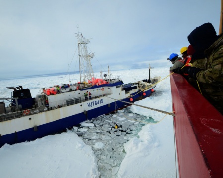 After meeting with the 207-foot fishing vessel Antarctic Chieftain, the crew of the Coast Guard icebreaker Polar Star took the vessel in a stern tow. The two vessels are surrounded by ice that is 12 feet to 15 feet thick covered with two feet of snow. Towing in ice is much more hazardous than towing in open water and is a slow process. The crew of the Polar Star and Antarctic Chieftain must remain vigilant and ready to respond to changing ice conditions. Upon reaching a small area of open water, also known as a polynya, the Antarctic Chieftain will commence testing the vessel’s ability to steam under its own power. Once testing is complete, Polar Star and the Antarctic Chieftain will proceed north through another 60 miles of ice.