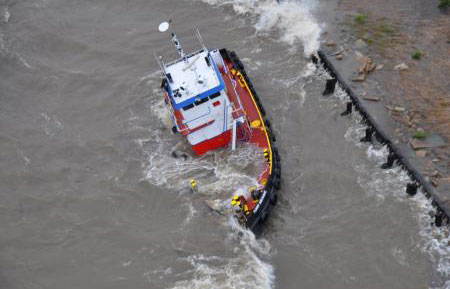 Watchstanders at the Coast Guard Sector New Orleans command center received a report the tug Todd Michael was taking on water and reportedly grounded on the rocks near the Lakefront Airport on Lake Pontchartrain with three people aboard.