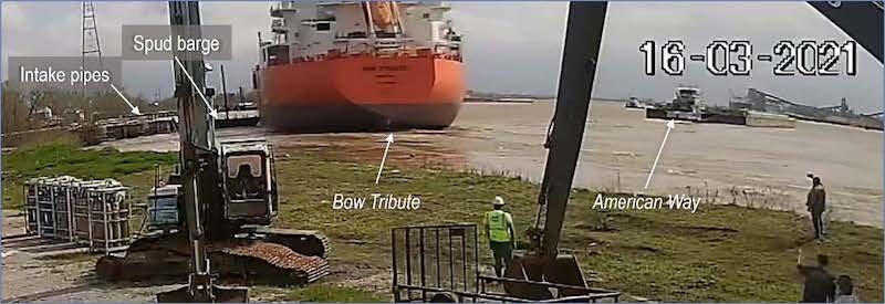 (Positions of the Bow Tribute, American Way, Capt JW Banta and Red Cosmos in the Carrollton Bend near New Orleans in the minutes leading up to the casualty, based on AIS data. The Bow Tribute’s subsequent contact at the two river intakes is also identified. Source: NTSB)
