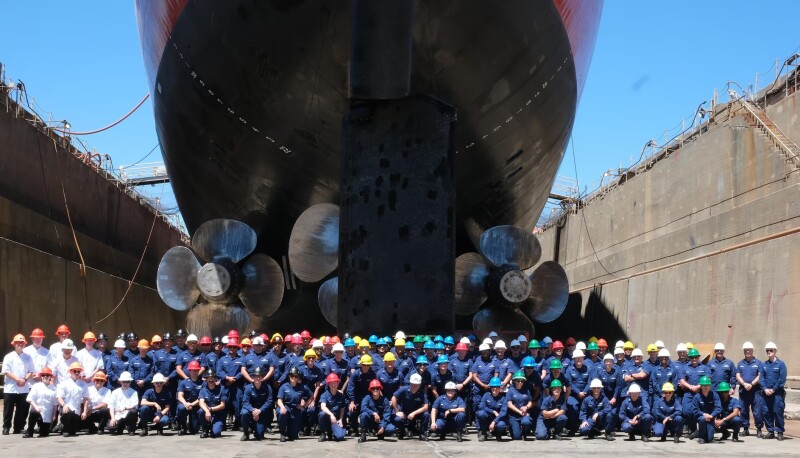 Additional major work completed includes removing the centerline shaft for servicing and inspection, exchanging all three propellers, and renewing both forward and aft main deck surfaces.