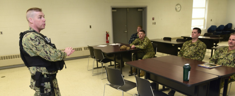 U.S. Navy Master at Arms 1st Class Matthew Duhaine of Brunswick, Maine, trains a class of U.S. Navy Reserve Sailors on the nuances of modern active shooter situations.