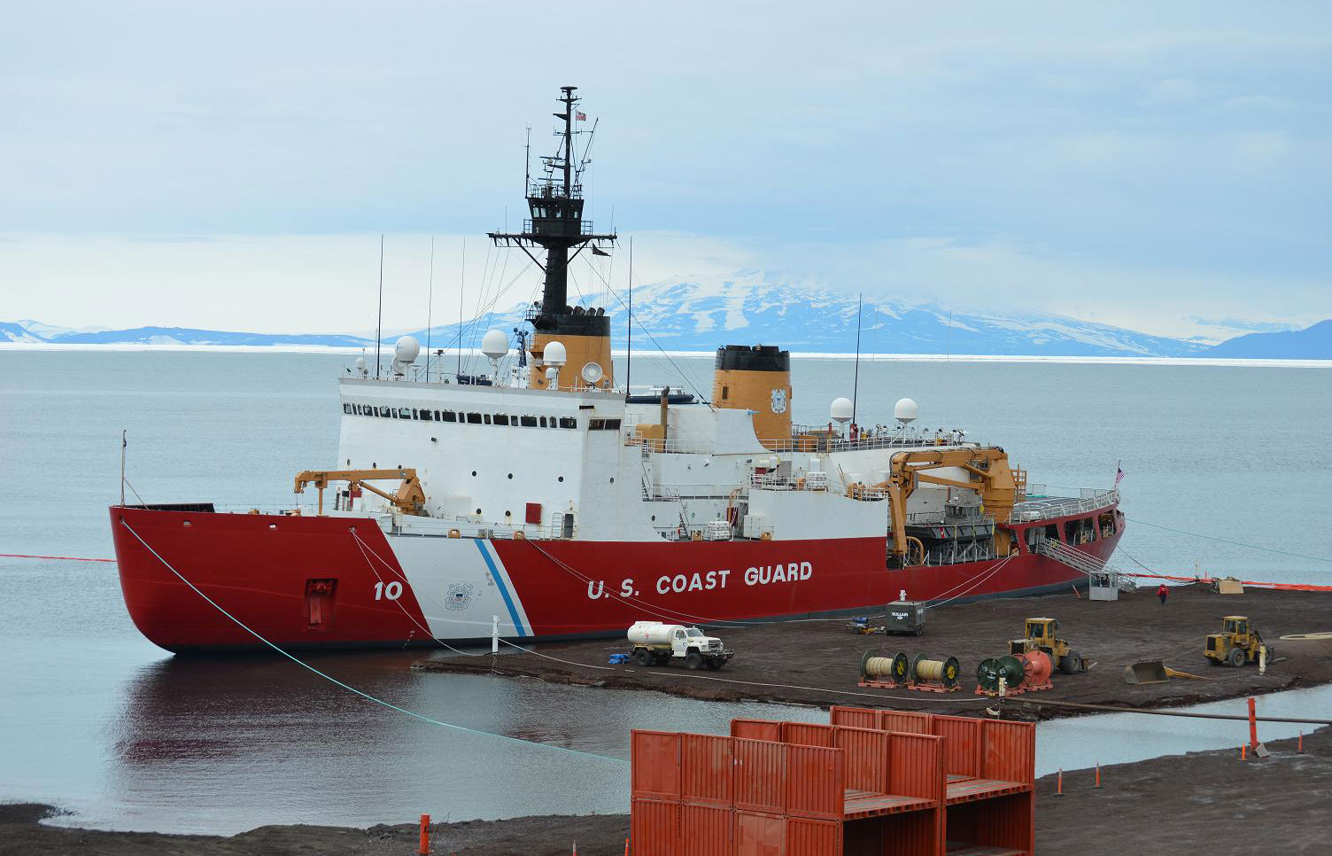 The shipping channel through the ice created by Polar Star was used by the tanker ship Maersk Peary to deliver approximately three and a half million gals. of fuel to McMurdo residents, allowing the station to remain manned and ready during the freezing winter months. The channel was also used by the cargo ship Maersk Illinois to deliver more than 500 containers of supplies to operate McMurdo and South Pole stations for the next 12 months.