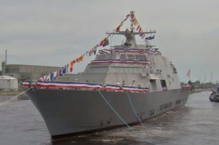 The ninth littoral combat ship, the future USS Little Rock, launched sideways into the Menominee River in Marinette, Wisconsin, on July 18. Ship sponsor Mrs. Janée Bonner conducted the time-honored tradition of christening the ship by smashing a bottle of champagne across the bow.