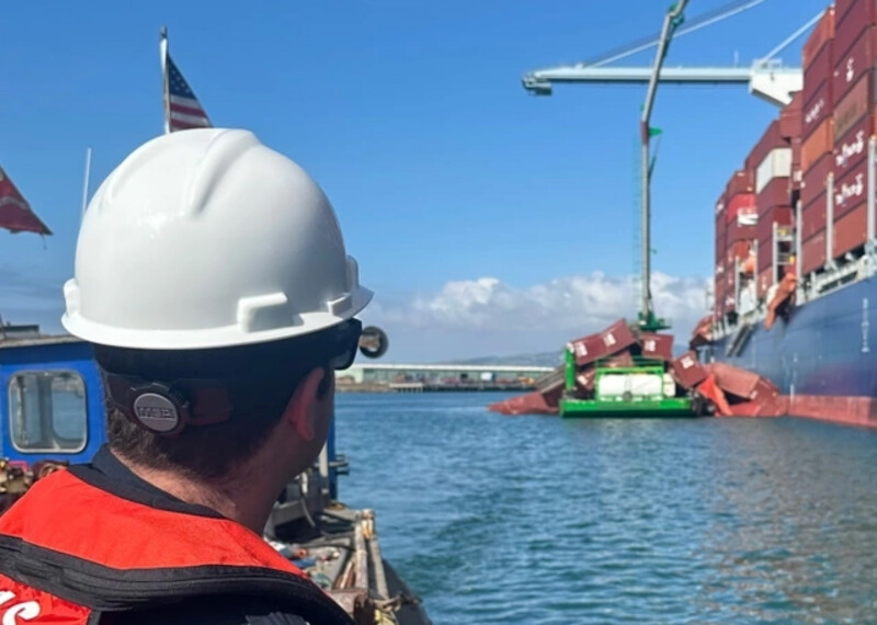 As it turned out, despite how bad things looked for the emissions-reduction barge alongside the Mississippi, the dramatic container avalanche of 95 boxes at Pier G in the Port of Long Beach proved to be not only non-fatal but nearly injury-free. And the one reported injury — a sprained ankle sustained by a crewmember on the barge who was fleeing on deck from the falling boxes — was minor, considering what could easily have happened.