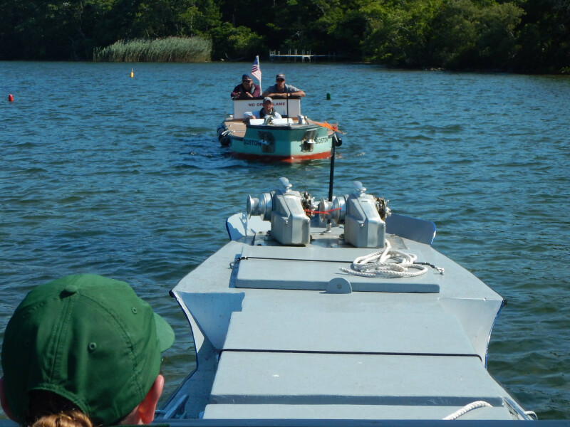 Each model holds two or three students, sitting above and behind a professional pilot who drives the boat. The students act as pilots, quietly ordering rudder and engine changes, which, as maritime procedure requires, are acknowledged and repeated by the helmsman. They can be a strange sight for the summer vacationers who share Great Herring Pond.