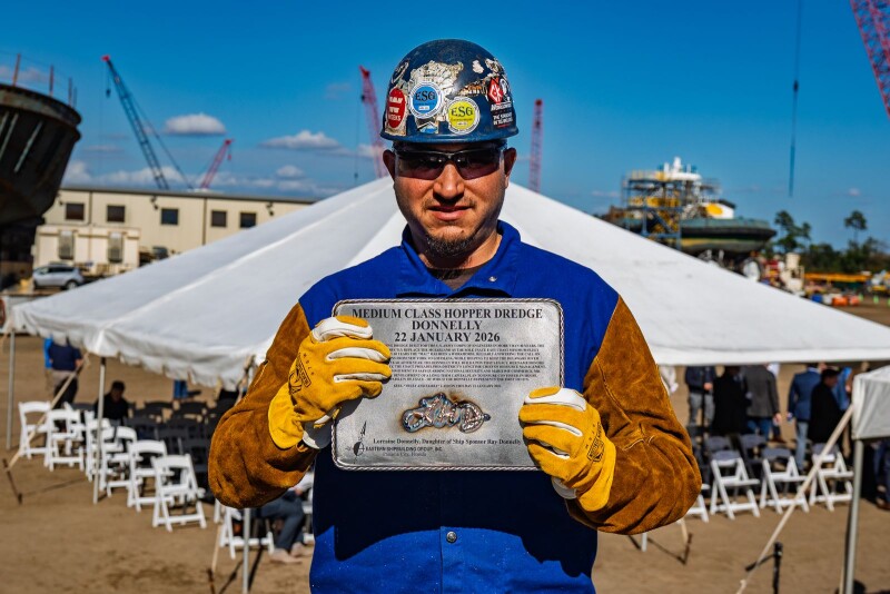 The 320'x72'x28' trailing suction hopper dredge has been under construction since April 2025. Eastern Shipbuilding Group Chairman and CEO Joey D’Isernia said the event reflected steady progress on the program as modular construction advanced.