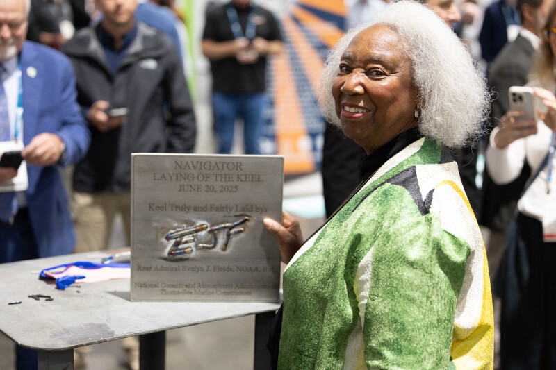 A keel-laying ceremony was held Thursday, the second day of the 2025 International WorkBoat Show, to officially mark the start of construction on Navigator, the first of two new charting and mapping vessels being built for NOAA by Thoma-Sea Marine Constructors LLC, Houma, La.