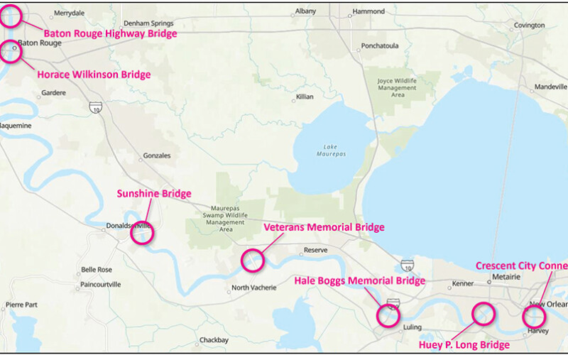 The bridges included in the update are the Crescent City Connection Bridges, Huey P. Long Bridge, Hale Boggs Memorial Bridge, Veterans Memorial Bridge, Sunshine Bridge, Horace Wilkinson Bridge, and Baton Rouge Highway Bridge. Previously, vertical clearance values for these bridges were based on mean high water levels tied to a historic 1927 Flood Stage. This approach often underestimated clearances, not accounting for current water levels or tidal cycles.