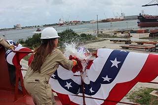 Crowley is among a small but growing group of U.S. operators who have adopted or are positioning themselves for LNG propulsion, to take advantage of lower emissions and low fuel costs. At the Florida christening representatives from Crowley and SeaRiver Maritime, Houston, which is chartering the vessel, watched Doris Evans, wife of Eric Evans, vice president, planning for Crowley’s petroleum services group, break the champagne bottle.