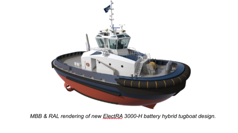 Master Boat Builders Inc. (MBB), together with naval architect and marine engineering firm Robert Allan Ltd. (RAL) announced the creation of a new battery hybrid tugboat design, the ElectRA 3000-H. The design has been developed over the past several months to suit the evolving needs of U.S. tugboat operators.