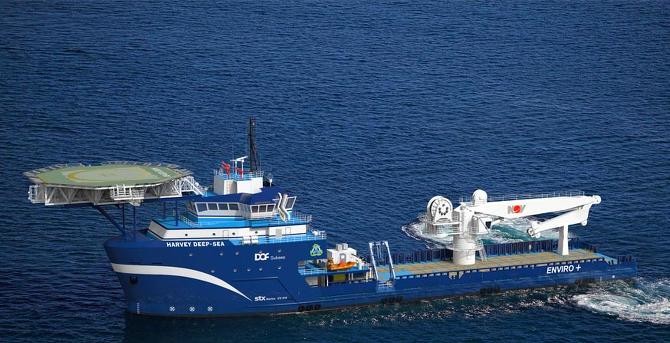 The 302'x64' Harvey Deep-Sea is equipped with a 165-ton NOV heave-compensated, subsea knuckle-boom crane capable of lifting/setting at depths up to 10,000 ft.; 15'x18' moon pool; S92 helideck, and has capacity for two ROVs and 70 persons on board.