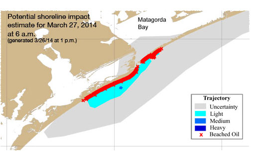 While a notable portion of the approximately 168,000 gals. of the marine fuel oil has been removed by responders in the Texas City-Galveston area, an area of floating oil approximately 15 miles off Matagorda Island is expected to be pushing shoreward by the weather over the next 24 to 48 hours.
