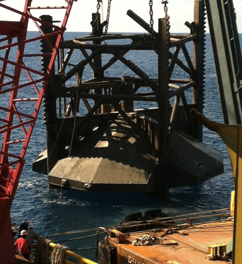 Those unique challenges are evident in one of his first projects as a salvage diver that occurred in 2011 as a result of Hurricane Gustov. Bisso Marine was contracted to cut in place a drill rig that had sunk in 130' of water of the coast of Louisiana. Utilizing heavy lift cranes and a chain-cutting pulley system, divers needed to utilize an underwater oxygen and magnesium cutting torch to carve out a patch to route the cutting chains through the rig’s hull. The chains were set in motion with the pulley system and the friction from the chain cut the steel hull into pieces as the links traveled back and forth throughout the hull. The downed rig was then heavy-lifted in massive pieces upon a barge and taken to the scrap yard.