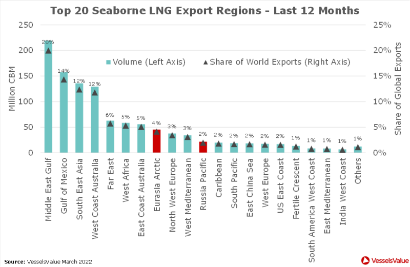 "Russia’s share of the seaborne LNG market is certainly large enough to move the needle on the global supply/demand balance,” said Srivastava. “Of the top 20 export regions over the last 12 months, Russia accounted for two, highlighted in red. The Eurasian Arctic contributed 4% of total volumes and the Russian Pacific another 2%. However, there are four much larger export regions, which each account for double-digit shares: the Middle East Gulf (20%), the Gulf of Mexico (14%), Southeast Asia (12%) and West Coast Australia (also 12%). Smaller changes in any of these four regions can outweigh larger changes in the two Russian regions."